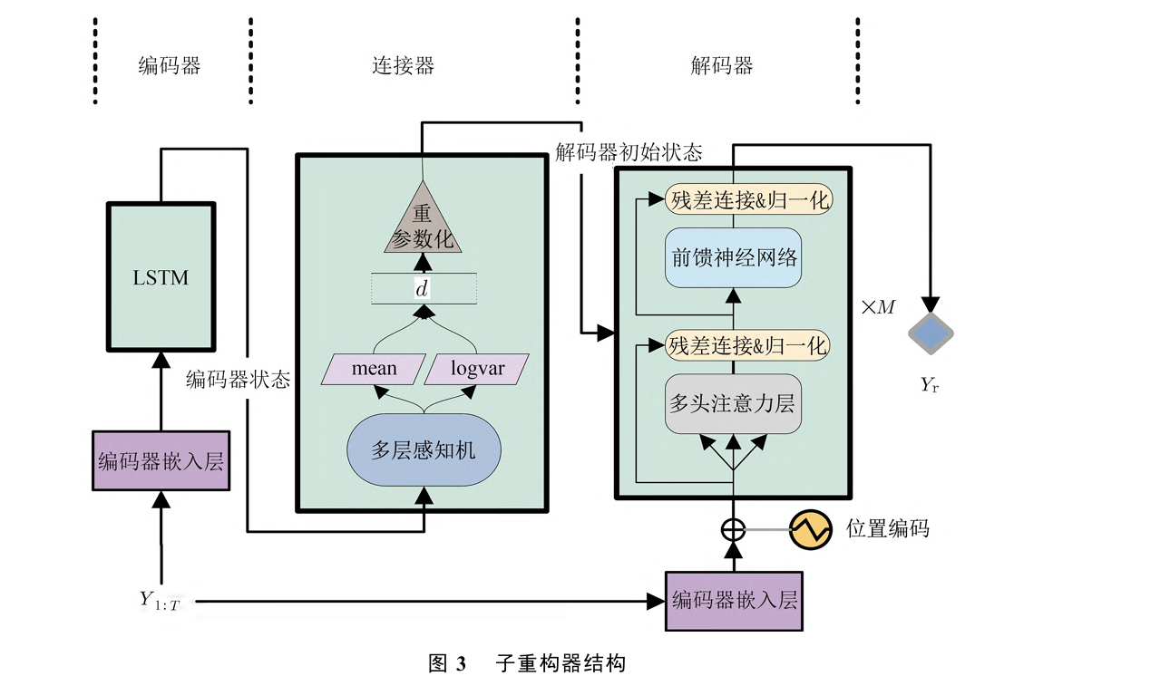 由于重构损失随着重构样本的不同而导致其差别很大,直接将重构损失作为传回生成器的奖励分数是不稳定的,因此增加子重构器作为R的基线模型以减小重构器奖励分数的不稳定性.其中R对假句子进行重构,R对真句子进行重构,它们的目标是使重构得到的句子接近放入品中的句子子重构器如图3所示,主要包括编码器、连接器和解码器3个部分