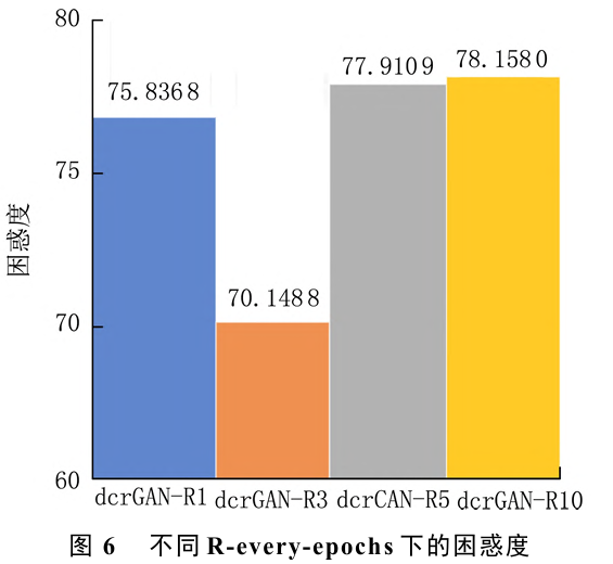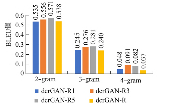 如下图所示,结果标明R-every-epochs为3 时,dcrGAN模型总体效果最佳,二元组BLEU值为0.5564,三元组BLEU值为0.2763,四元组BLEU值为0.0912,困惑度为70.1488。