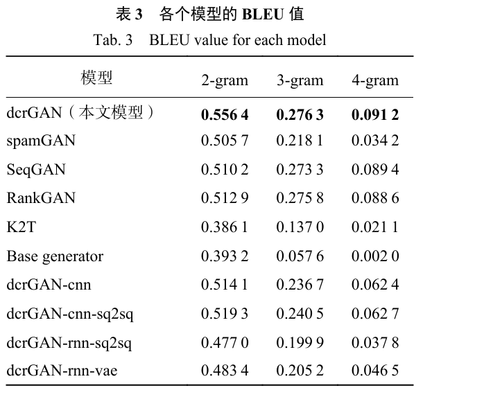 实验采用BLEU值的二元组、三元组及四元组精度作为主要评价指标(该指标较多使用于文本生成领域. 其值范围为0~1,数值越大表示生成效果越好。)