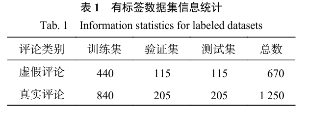 使用Li等人的虚假评论数据集,该数据集原本数据量为 9 765 条,将其中经过分词后的评论字符数少于 12 、与评价事物毫不相干、标点符号数目在此条评论占比高于该评论总字符数的 75% 、评论中有非中文字符的这些评论进行剔除,剩余 8 896 条评论。