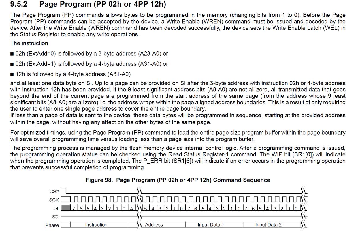 为优化时序,使用页编程(PP)命令在页边界内加载整个页大小的编程缓冲器,相比于加载不足一页的数据到编程缓冲器,将节省总体编程时间。