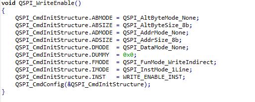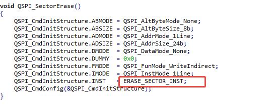 接着第17行,发送写使能命令。该函数主要配置QSPI->CCR寄存器,主要配置指令写使能指令和简介写模式,其余配置读者可查阅AS32X601设计手册的QSPI章节,这里不做过多赘述。