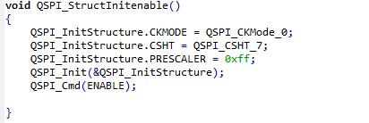 首先看第16行,对QSPI结构体初始化,分别配置片选高电平时间,QSPI时钟信号在指令之间的电平,QSPI时钟分频。