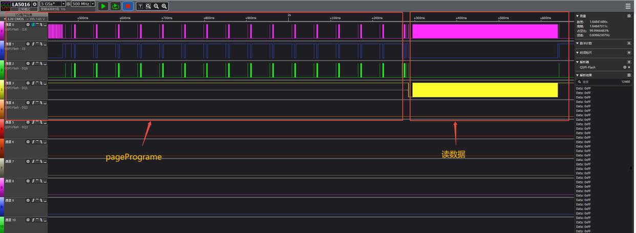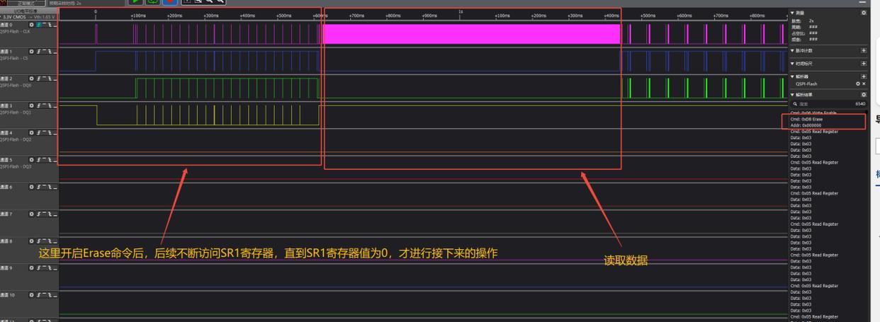 程序初始化后,调用QSPI_FlashErase(0x00, 1),从0地址开始,擦除1个扇区,观察打印信息,并截取了逻辑分析仪片段。