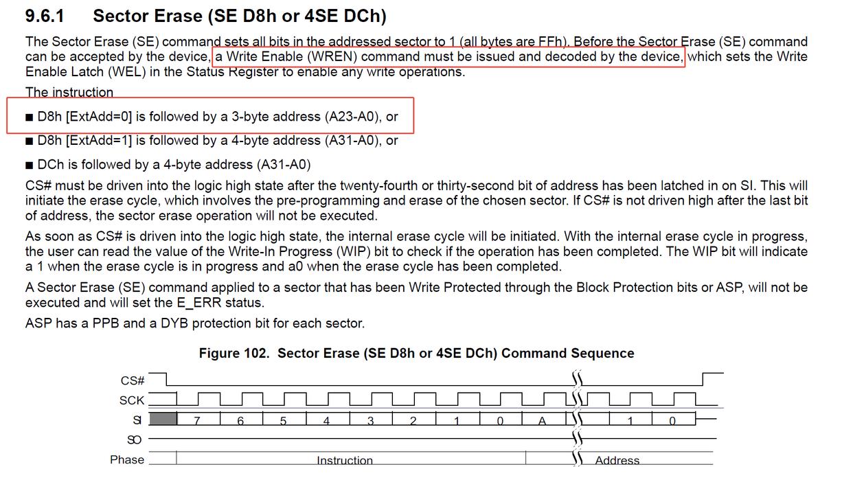 根据指导手册我们知道,在进行扇区擦除命令之前必须先给一个WREN 命令,该命令会将状态寄存器中的写使能锁存器(WEL)置位,以允许任何写入操作。此外,本文用例使用3字节地址,根据时序图可知,应先发送指令(长度可配置)接着发送一个24位地址。