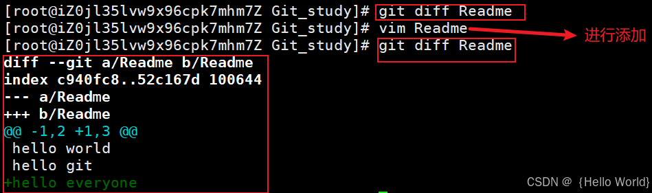 文件状态:此时Readme的修改仅在工作区(未执行git add),所以git diff能直接显示差异。
