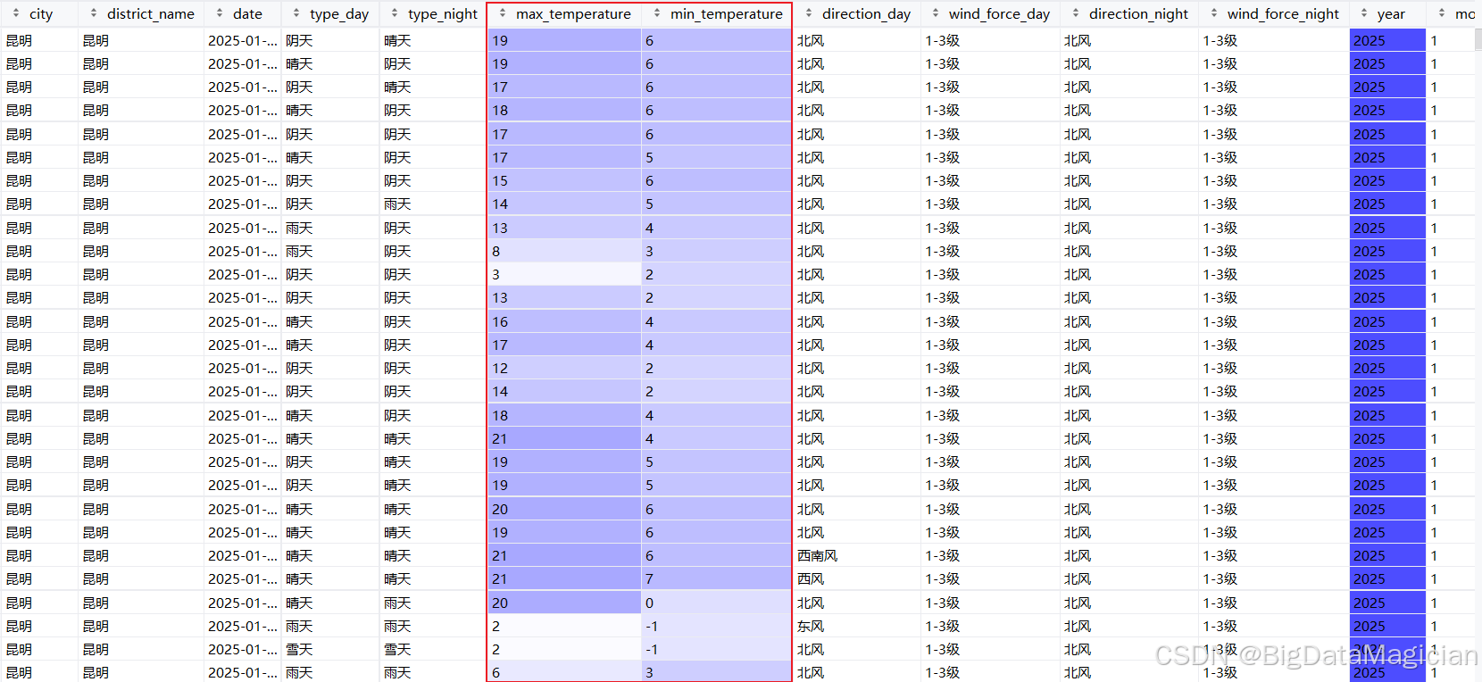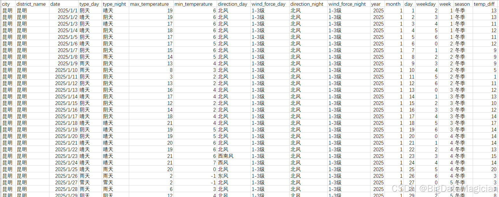 处理后数据如下图,从处理后的数据能看到,原本带 "℃" 的温度值(如 "19℃"),现在已转为纯数字格式。统一格式后的温度数据更便于后续计算(比如统计月均温),而温差的隐含信息也被提取出来,能直接用于分析不同天气下的温度波动情况。