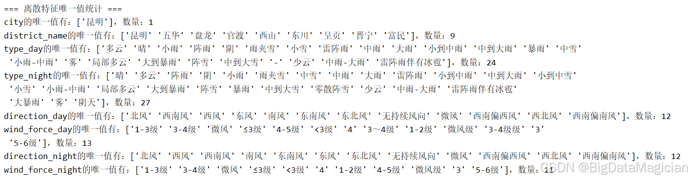 离散特征统计结果显示city仅为"昆明",district_name含多个区县;type_day/night有晴、多云、小雨等十余种取值,wind_force_day/night存在"1-2级、微风、≤3级"等不规范表述,直接支撑后续天气类型简化、风力等级标准化的需求;若缺失目标列,会即时提示异常。