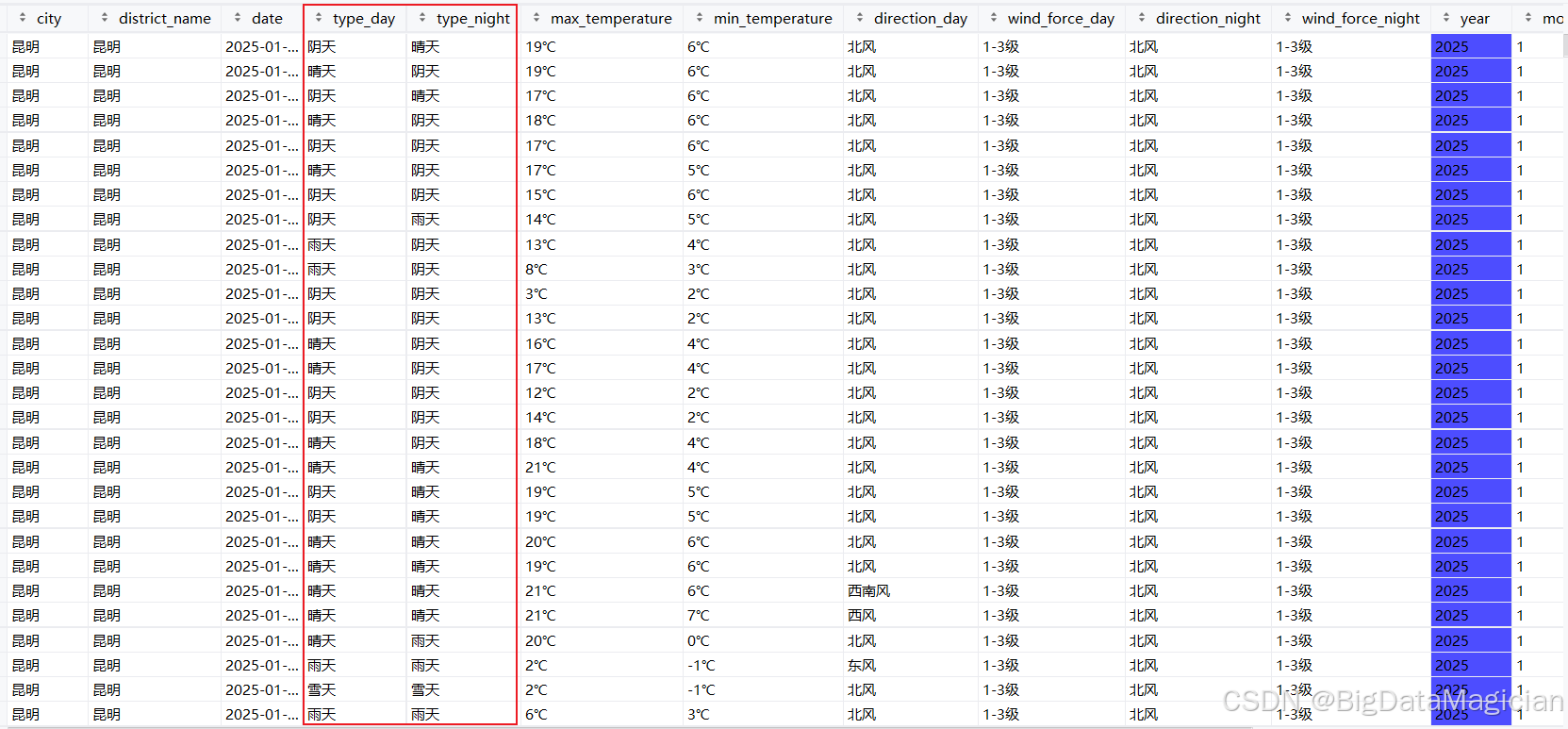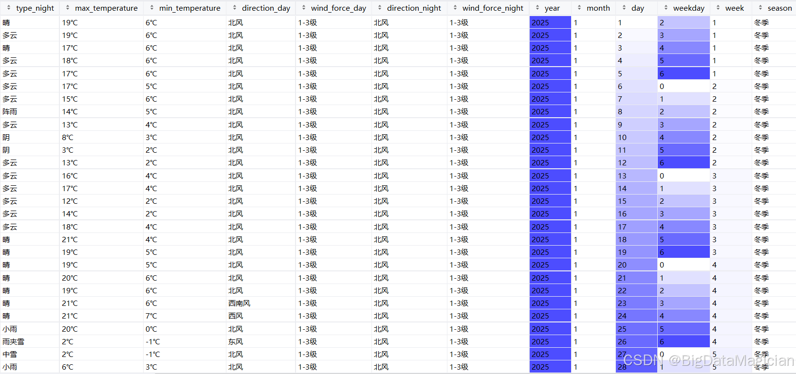 处理后部分数据如下图所示,从处理后的数据能看到,原本细分的天气表述(比如 "晴""阴"),现在统一成了 "晴天""雨天" 等大类。简化后的天气类型更简洁规整,既保留了天气的核心属性,又避免了细分类型过多带来的分析冗余,方便后续统计不同天气类别对应的温度变化、出现频率等分析工作。