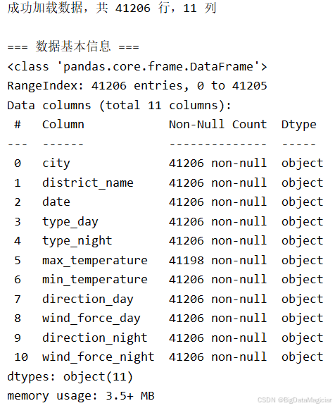 成功加载则输出41206行11列,直观呈现数据规模;失败则精准提示错误原因(文件不存在/格式错误等),快速定位问题。数据基本信息结果显示所有列均为object类型、无缺失值,明确后续需将日期列转datetime、温度列转数值型,且无需处理空值。