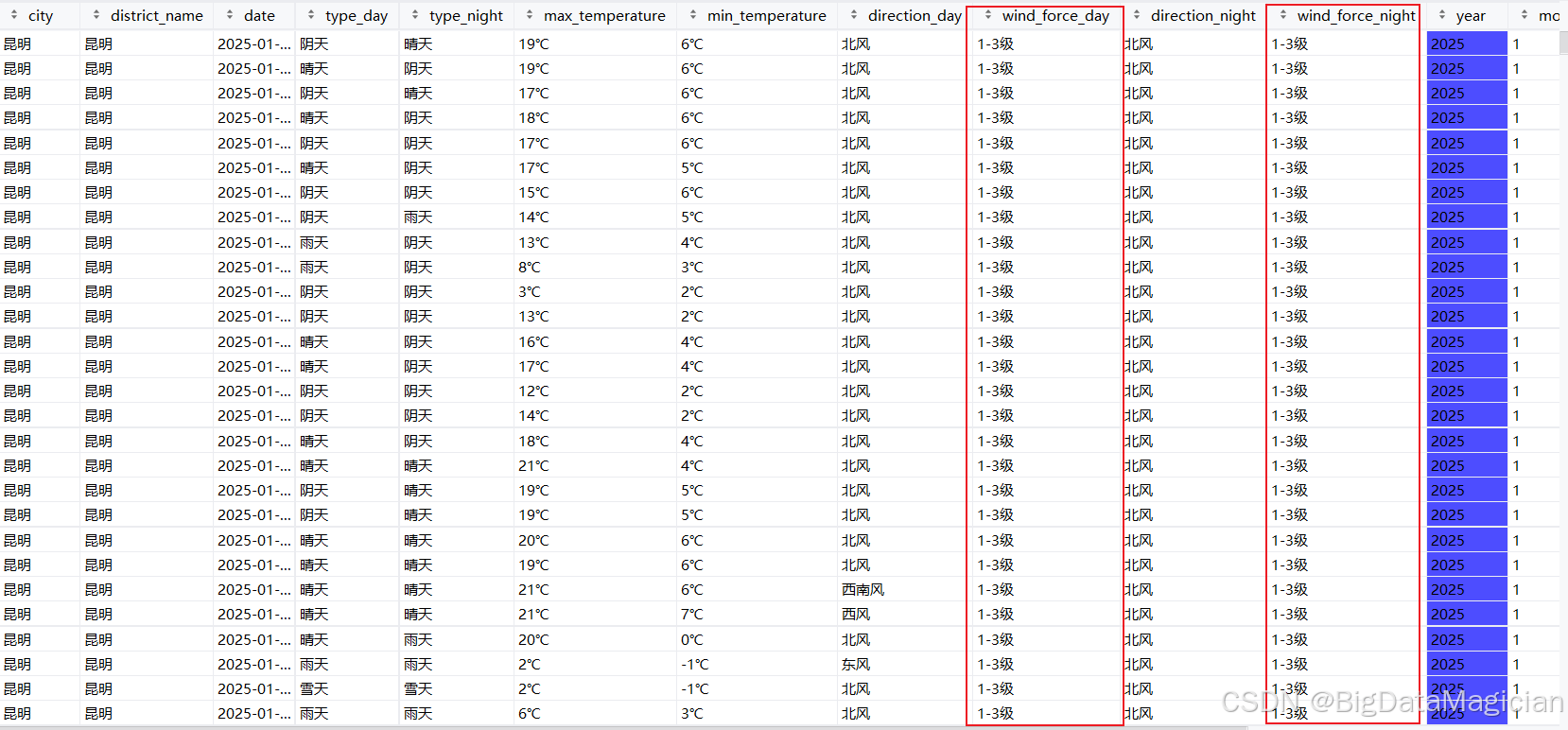处理后部分数据如图所示,从处理后的数据能看到,原本不同表述的风力(比如 "1-2 级""微风"),现在都统一成了 "1-3 级" 这样的标准等级。标准化后的风力等级更规整,既保留了风力的核心区间信息,又避免了表述混乱带来的分析干扰,方便后续统计不同风力等级对应的天气、温度等关联特征。