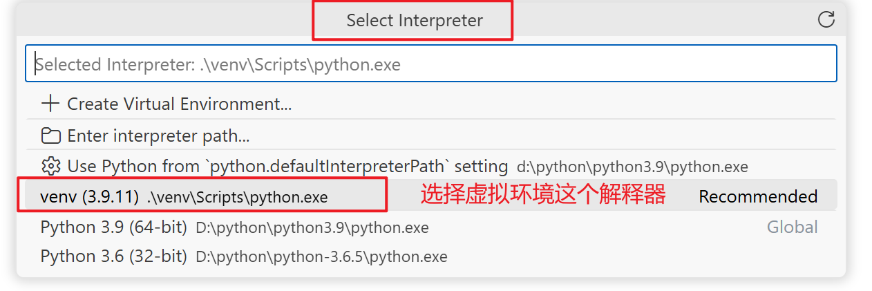 Ctrl+Shift+P,将python解释器切换到虚拟环境。输入Python: Select Interpreter