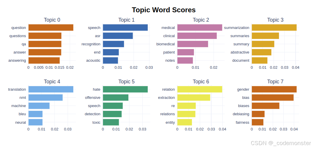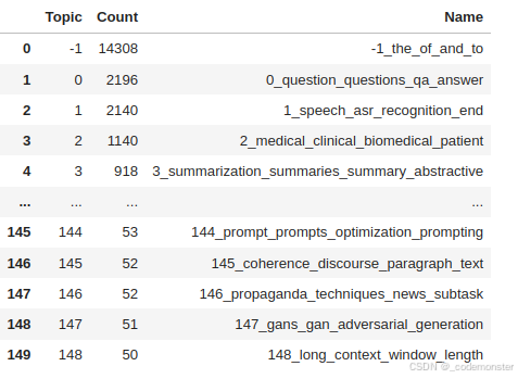 - 包括主题ID、文档数量、主题名称、关键词表示等