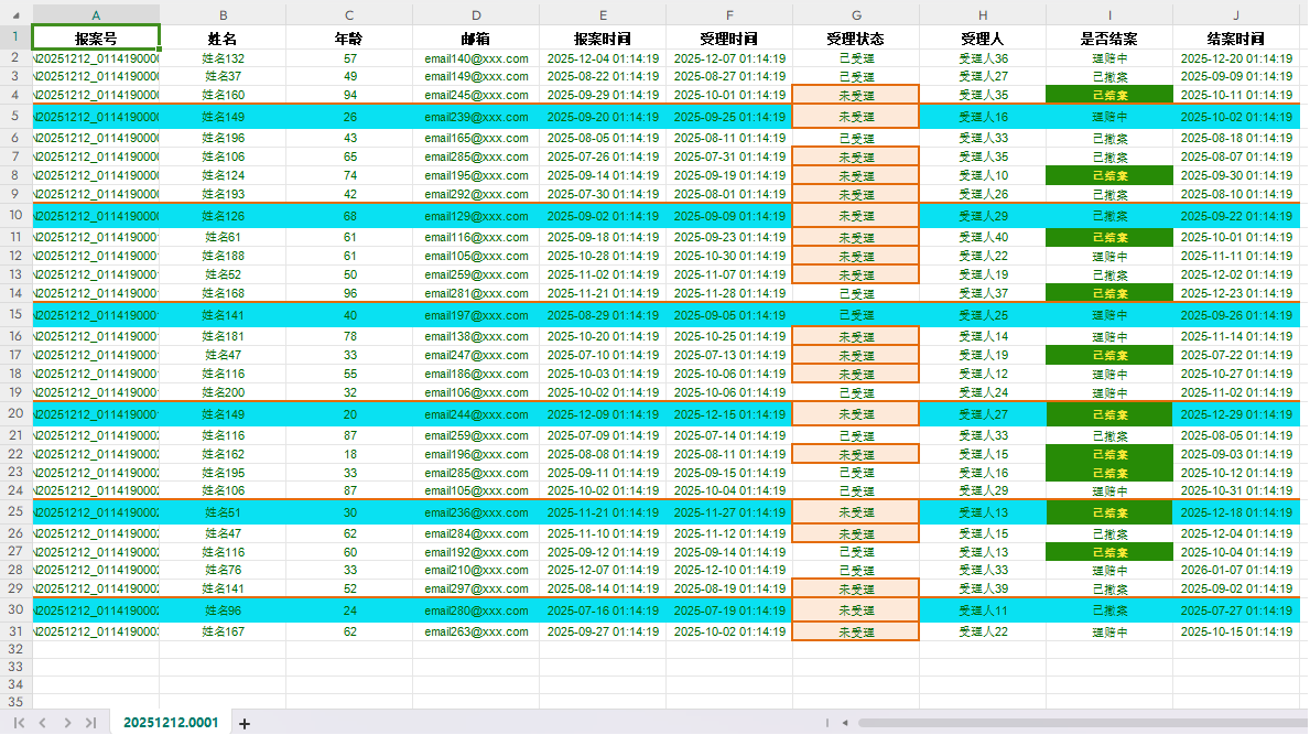'''['报案号','姓名','年龄','邮箱','报案时间','受理时间','受理状态','受理人','是否结案','结案时间']'''