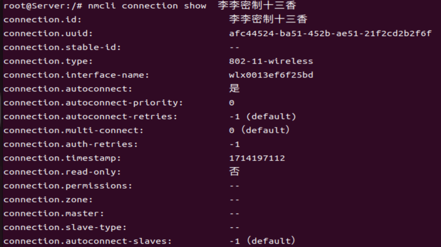 [root@localhost ~]# nmcli -a device wifi con 李李密制十三香