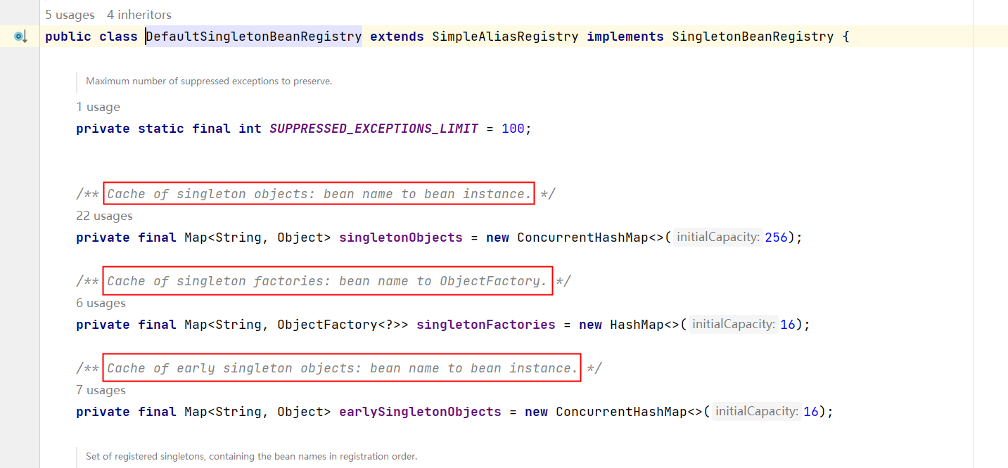**Cache of singleton objects: bean name to bean instance. ** 单例对象的缓存:key存储bean名称,value存储Bean对象【一级缓存】