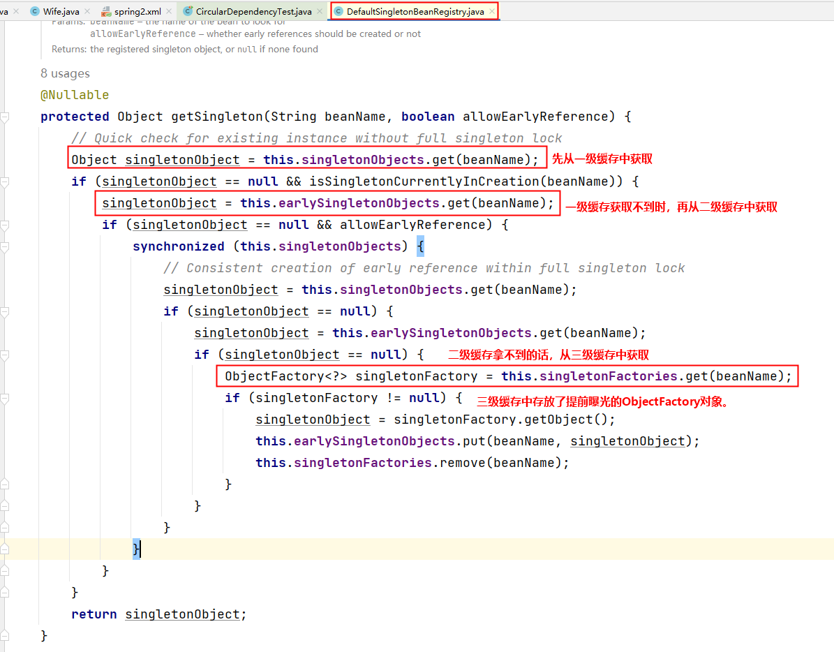 从源码中可以看到,spring会先从一级缓存中获取Bean,如果获取不到,则从二级缓存中获取Bean,如果二级缓存还是获取不到,则从三级缓存中获取之前曝光的ObjectFactory对象,通过ObjectFactory对象获取Bean实例,这样就解决了循环依赖的问题。