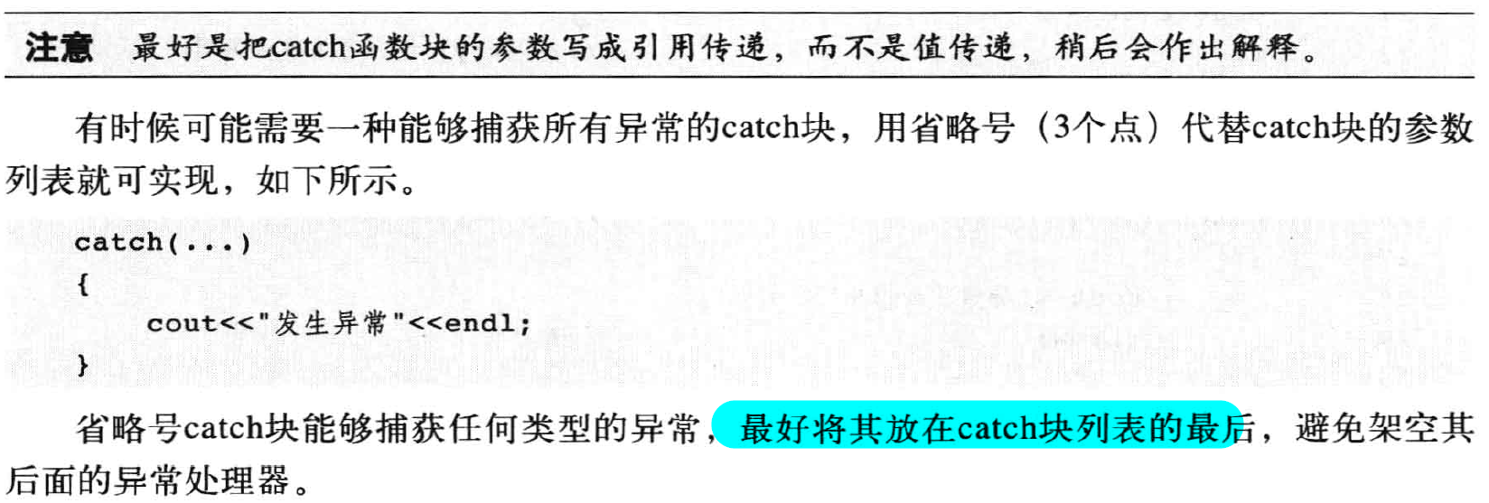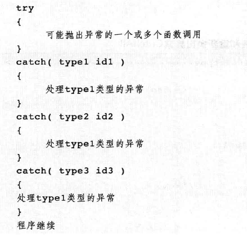 之后跟随一段以{ } 圈出来的程序代码,那是exception 处理例程之所在。catch 应该紧跟在try 之后。