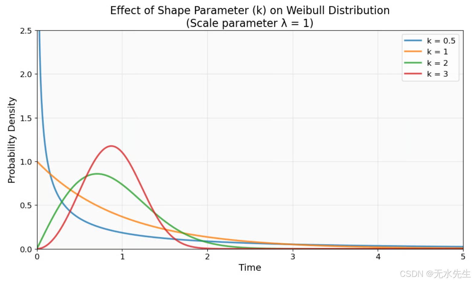 该函数显示了故障概率密度如何随时间变化,形状参数 k 决定了故障是更容易在早期发生(k < 1)、随时间保持不变(k = 1)还是随着年龄的增长而增加(k > 1)。