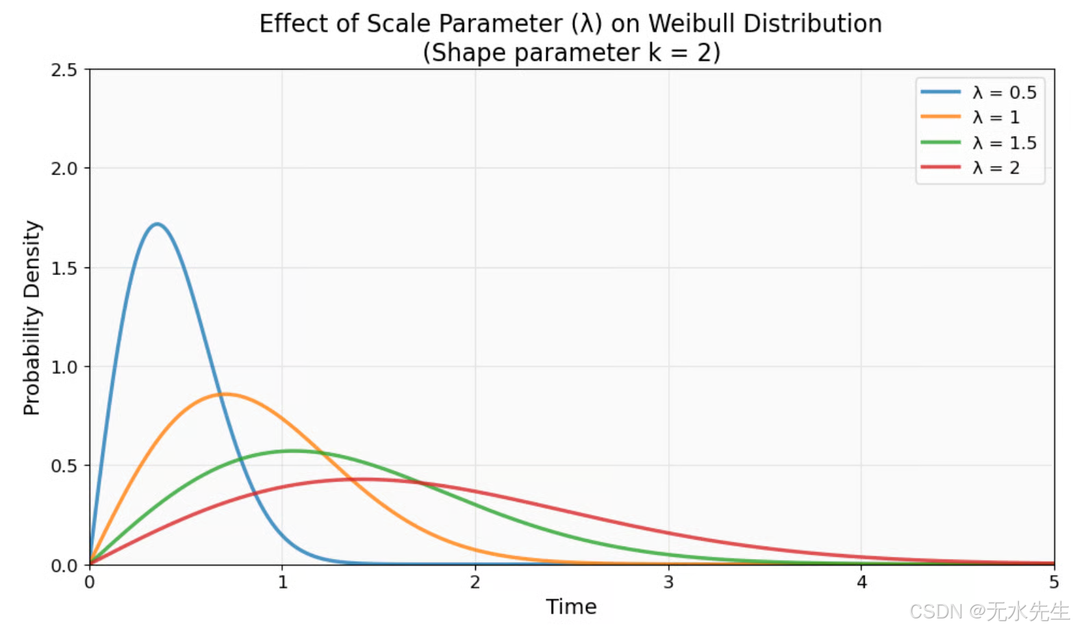 尺度参数 (λ) 如何影响 Weibull 分布沿时间轴的移动?较大的 λ 值会使分布向右拉伸(特征寿命更长),而较小的 λ 值会使分布向左压缩(特征寿命更短)。分布形状保持不变。图片由作者提供。