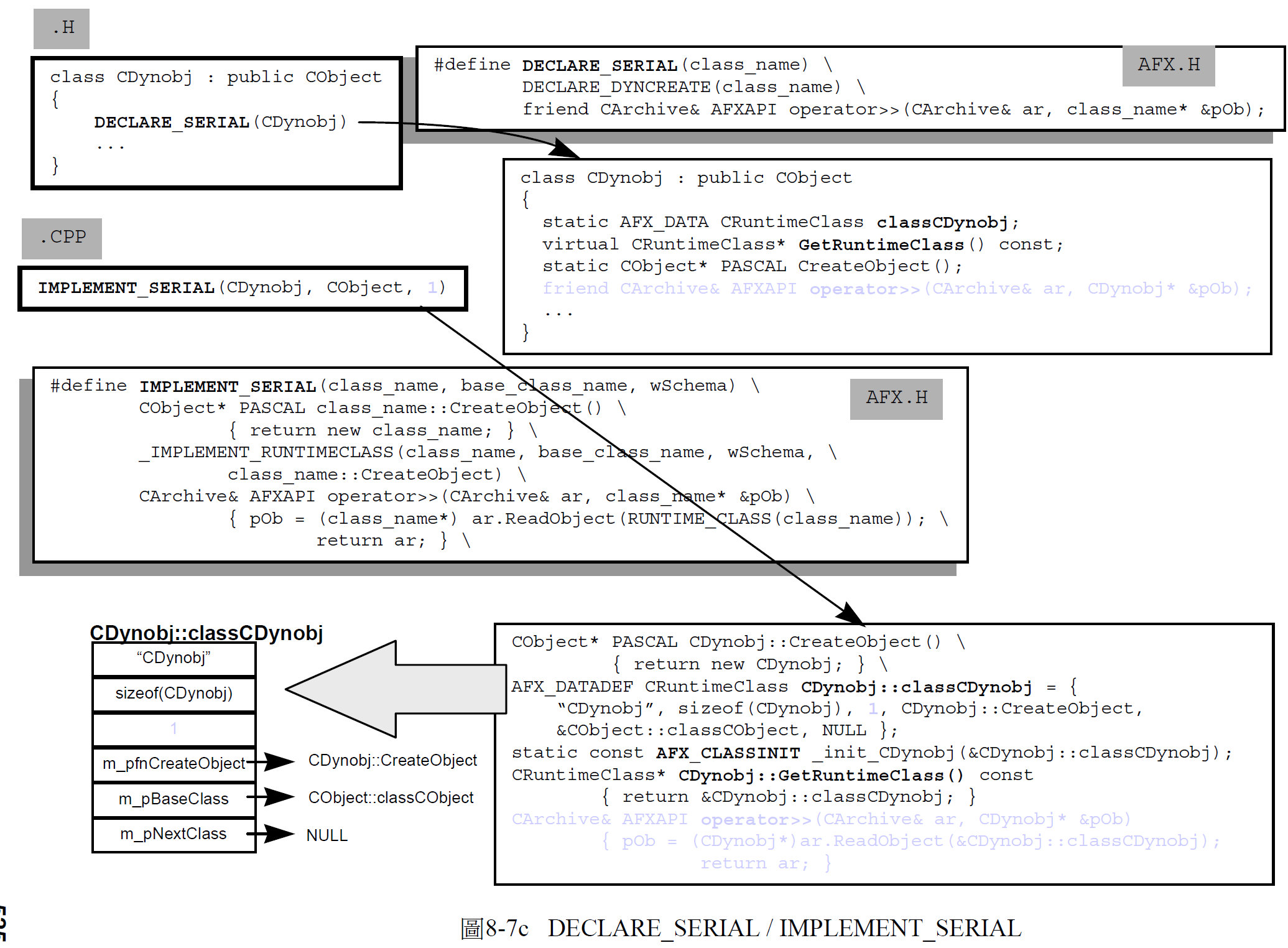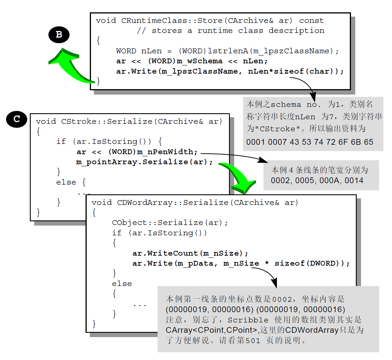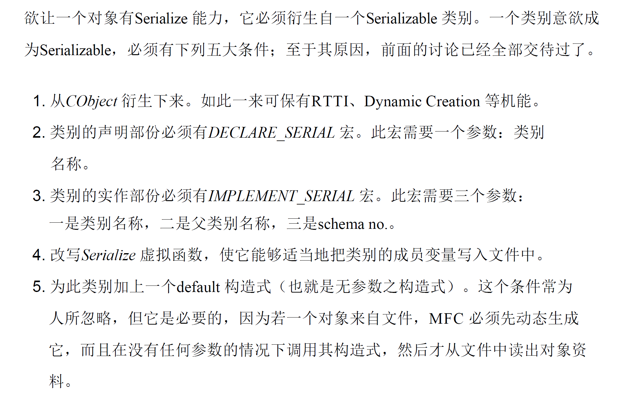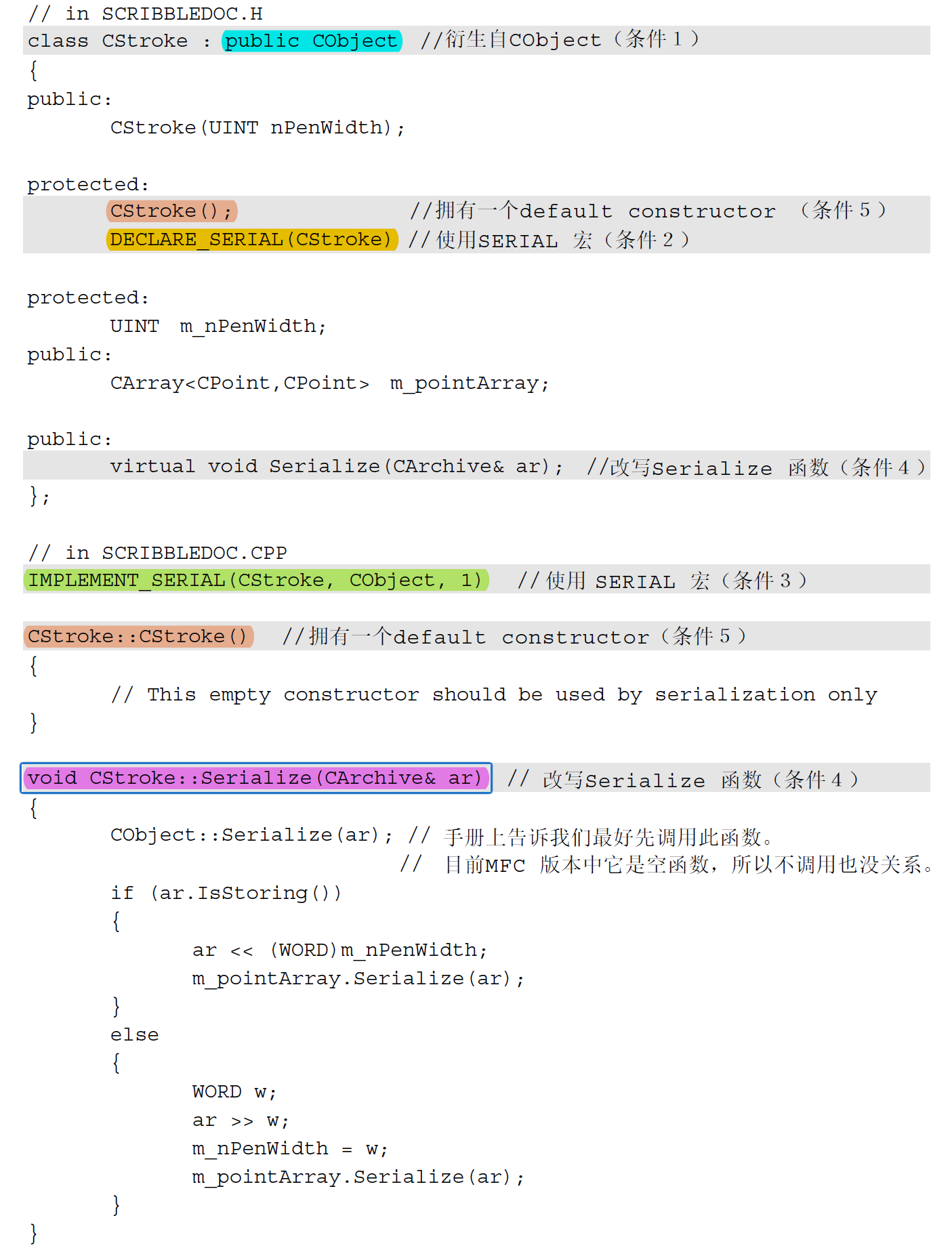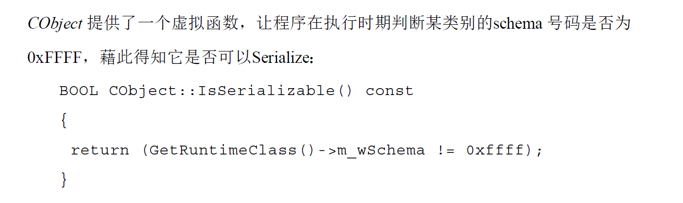 一个类别若要能够进行Serialization 动作,必须准备Serialize 函数,并且在「类别型录网」中自己的那个CRuntimeClass 元素里的schema 字段里设立0xFFFF 以外的号码,代表资料格式的版本。