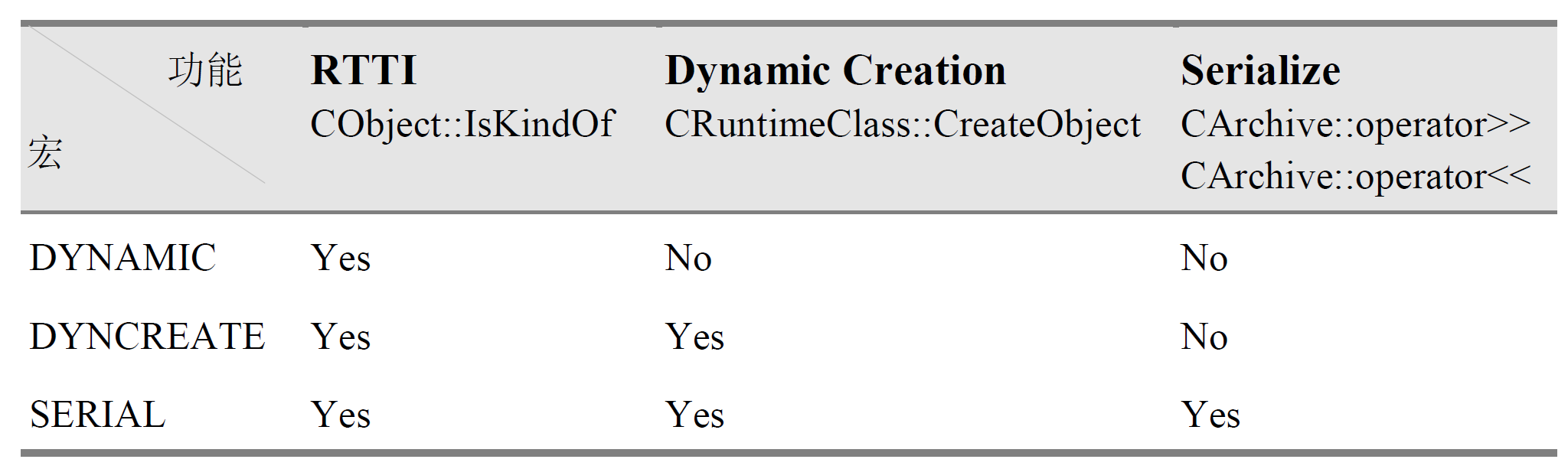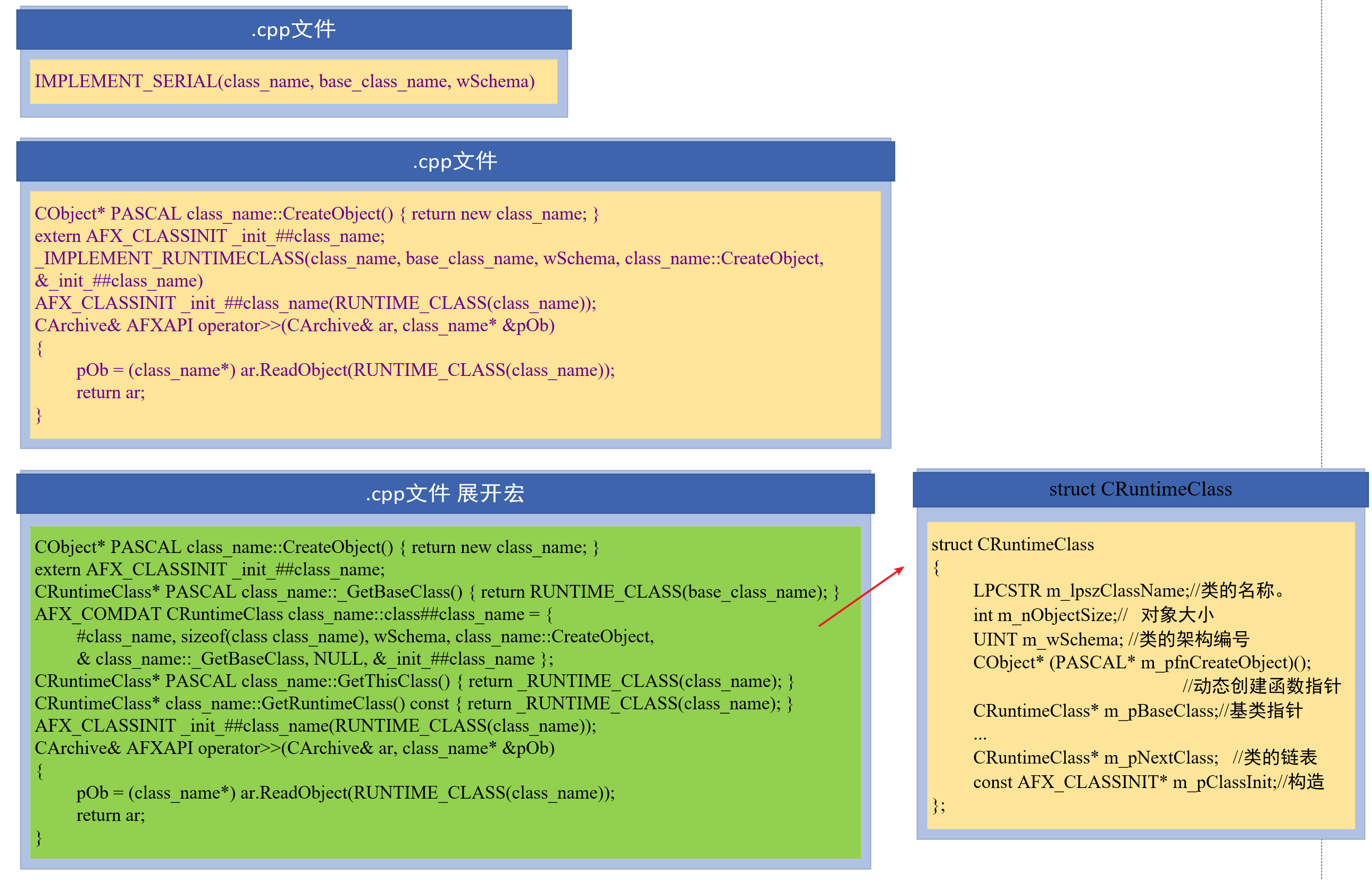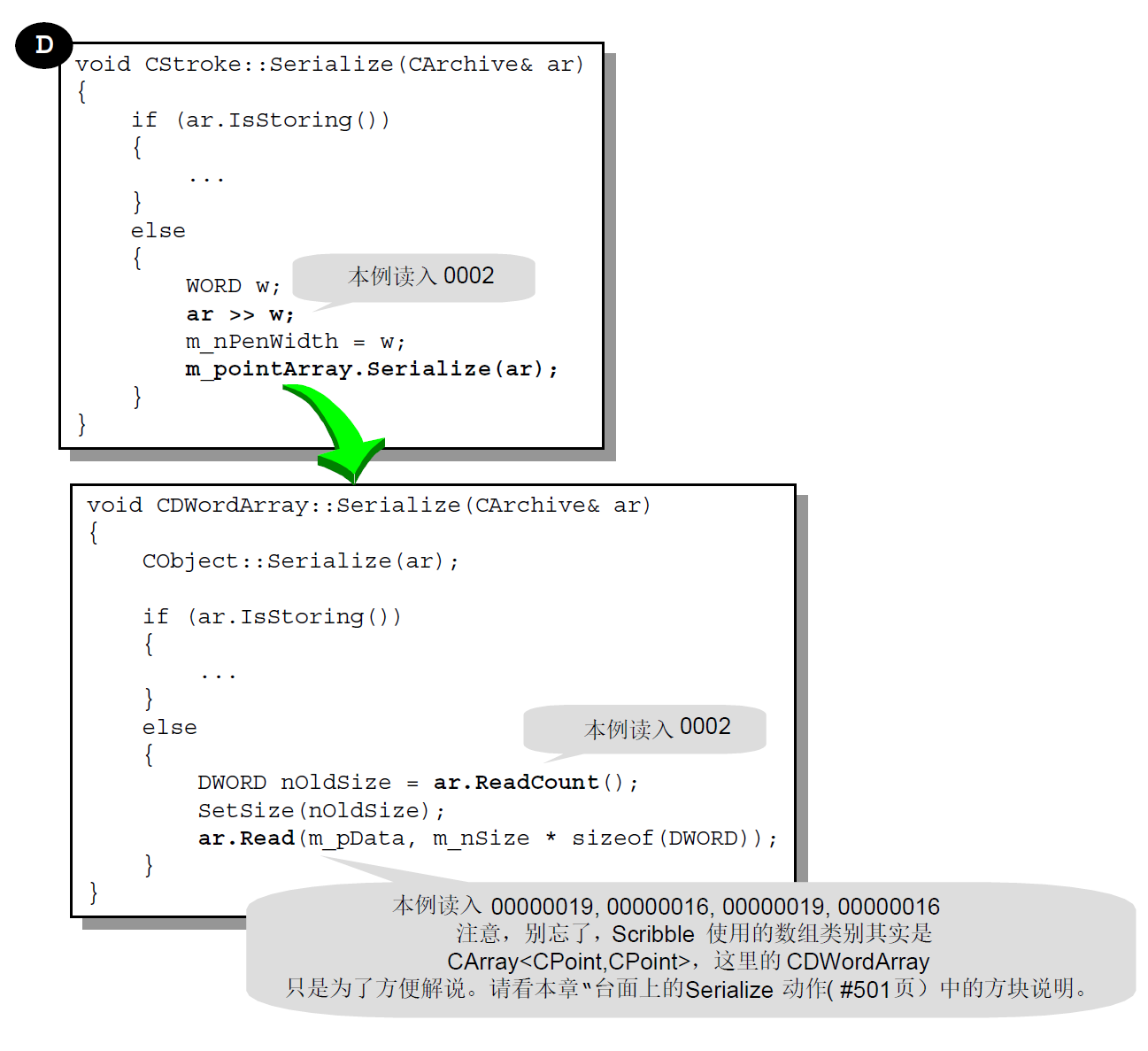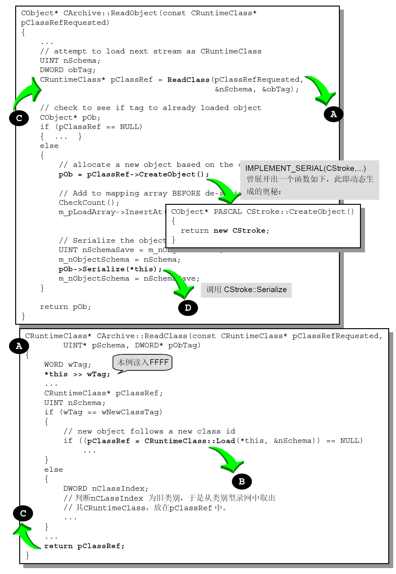 一个类别若要能够进行Serialization 动作,必须准备Serialize 函数,并且在「类别型录网」中自己的那个CRuntimeClass 元素里的schema 字段里设立0xFFFF 以外的号码,代表资料格式的版本。