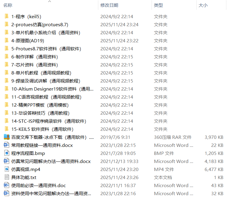 全部资料包括程序(keil5)、protues仿真(protues8.7)、设计说明、答辩PPT、开发资料、资料使用介绍、仿真视频、最小系统介绍视频等。