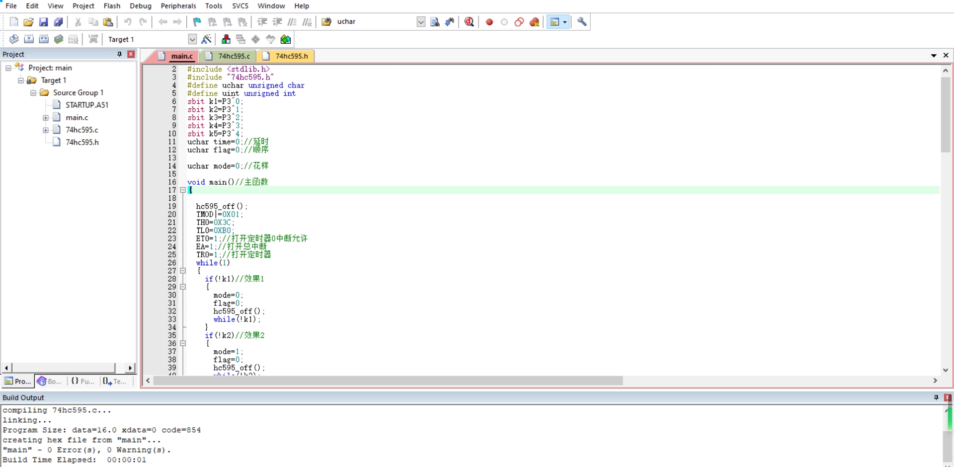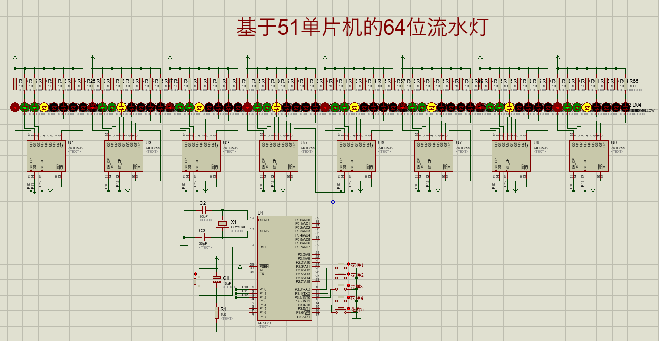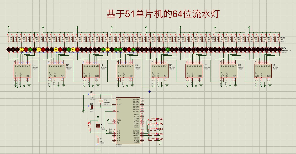 利用单片机控制64位LED灯实现流水灯功能,5个按键切换5种流水灯花样。