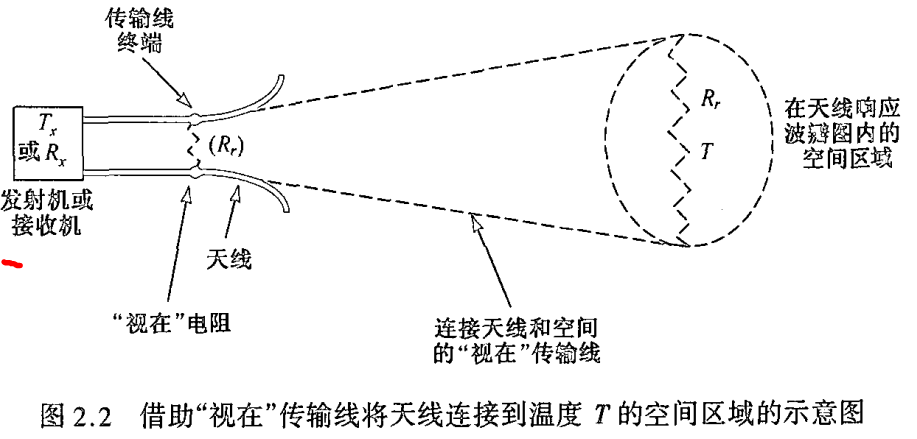按电路的观点,从传输线看向天线等效于一个电阻Rr,称为辐射电阻。这是从空间耦合到天线终端的电阻,与天线结构自身的任何电阻无关。在发射时,天线的辐射功率被树木、建筑物、地面、天空以及其他天线所吸收。在接收时,来自远处目标的被动辐射或其他天线的主动辐射将提升Rr的外观温度。对于无损耗的天线来说,这种外观温度对天线自身的物理学温度并没有影响,而只是天线所"看到"的远处目标的温度,如图2.2所暗示。在这个意义上,天线当成一种遥感测温的器件。