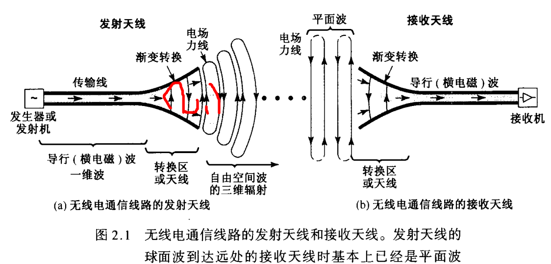 图2.1(a)中的双线传输线连接着无线电频率的发生器。沿传输线的均匀段,两线间距远小于波长,能量以平面电磁波的模式导行,只有很少的损失;沿传输线的渐变张开段,两线间距达到或超过波长的量级,将波向自由空间辐射而表现出天线的性质。电流从传输线流向天线,又从天线流回传输线,但电流所产生的场却持续向外推进。