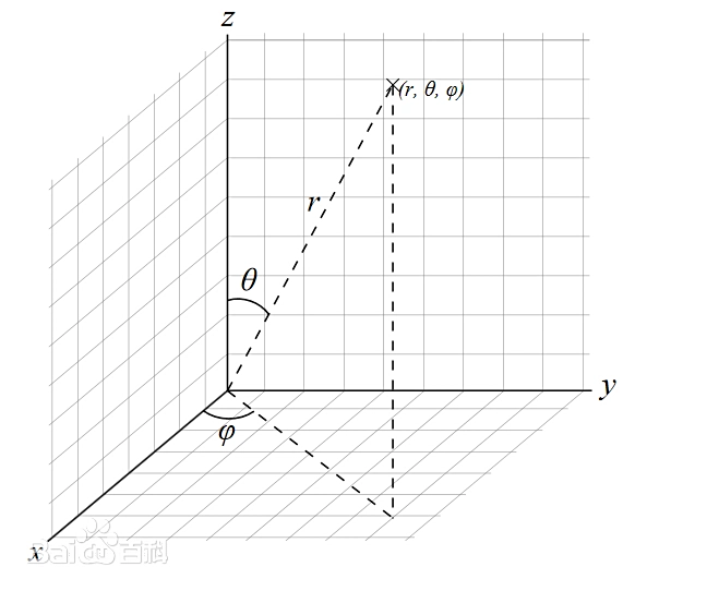 球坐标。Spherical coordinate。球坐标(r,θ,φ)表示点p的三维正交坐标。如图,原点到p点的距离r,原点到p的连线与正z轴的夹角θ天顶角,该连线在xy平面的投影线,与正x轴夹角为方位角φ。
