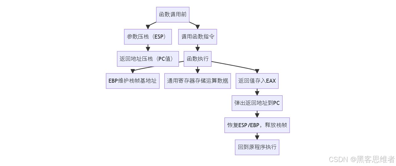 函数调用前:将函数参数(a、b)压入栈(ESP控制栈顶地址),同时将"函数返回地址"(当前PC的值,即函数调用后要执行的下一条指令地址)压入栈;