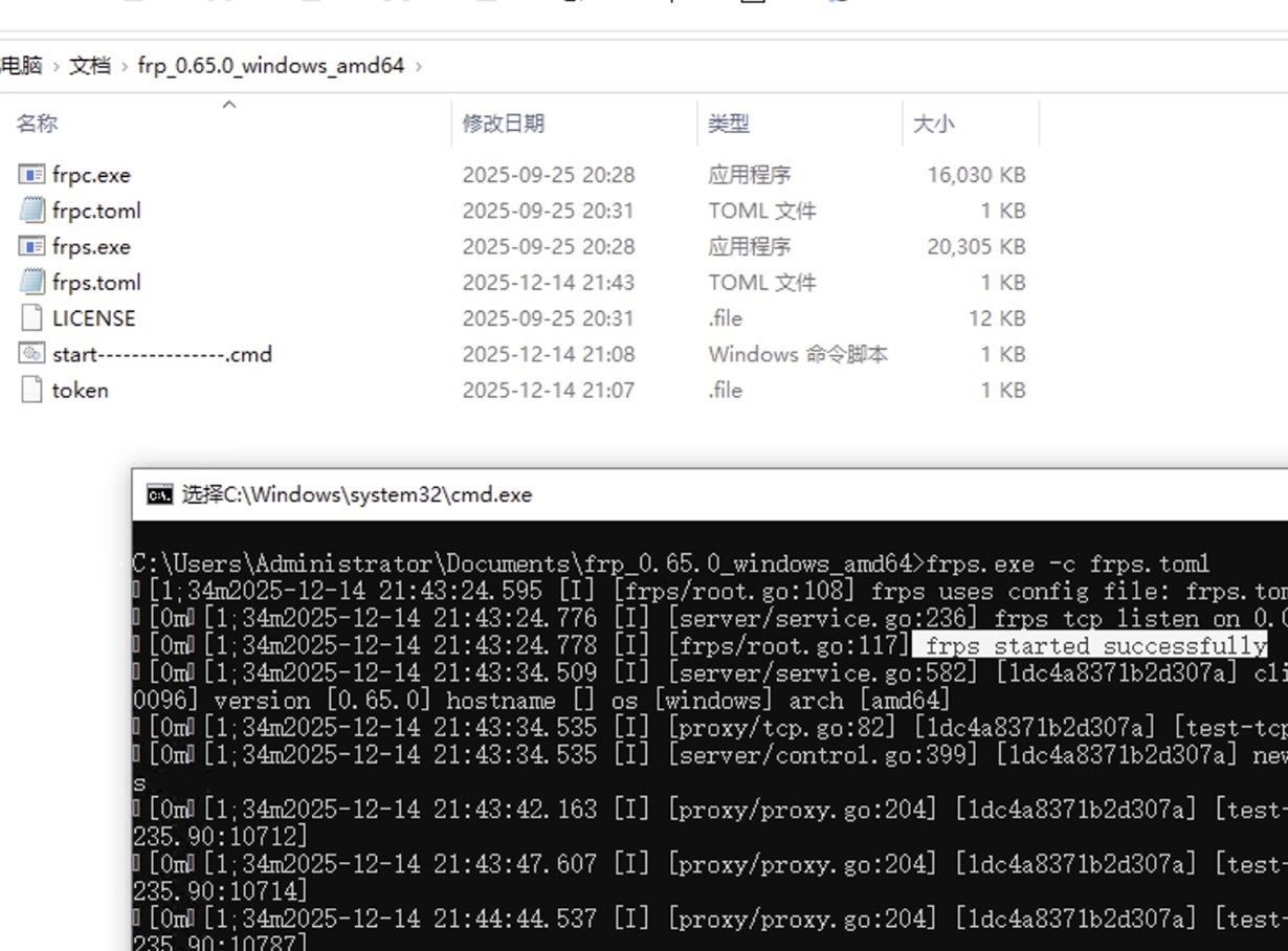 服务器cmd执行frps.exe -c frps.toml,若经常关闭和启动,新建一个START.cmd,内容是