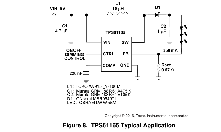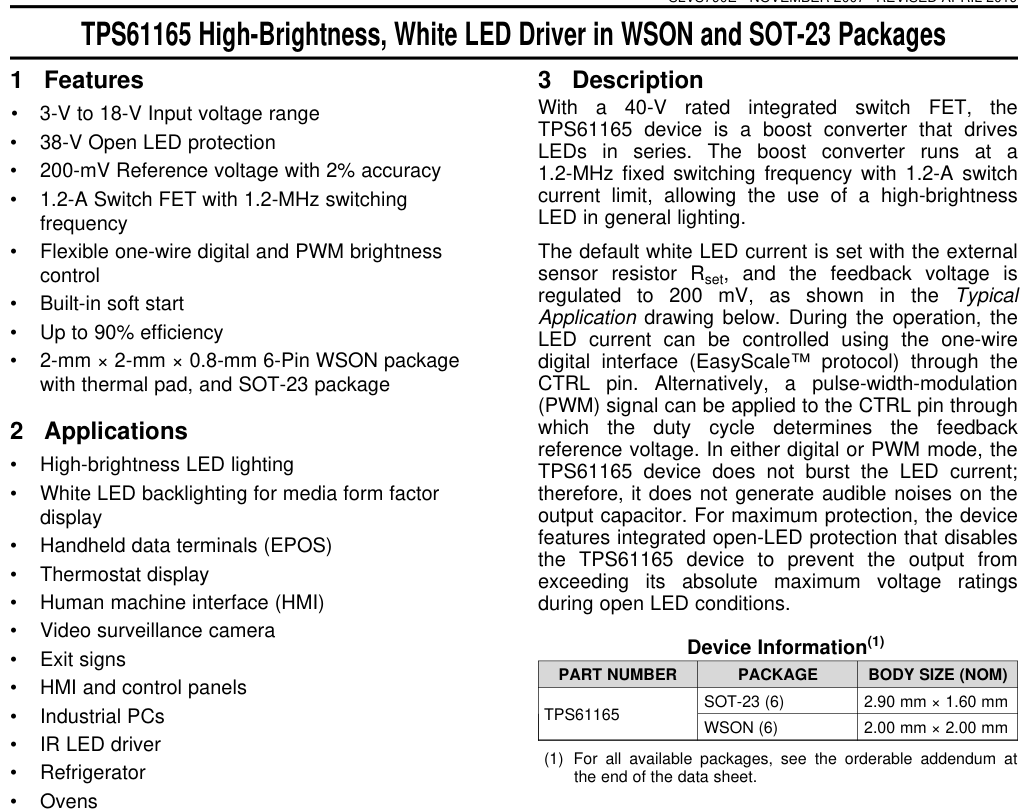 TPS61165是一款白色LED灯驱动芯片,输入电压3~18V,开关电流最大1.2A。具有LED开路保护,可以PWM调光或者高低电平控制。