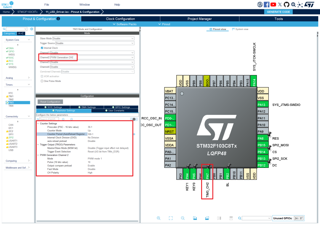 VBUS连接12V输入电源,笔者选用STM32F103C8T6作为MCU,LED_CTRL1连接单片机的PA7引脚