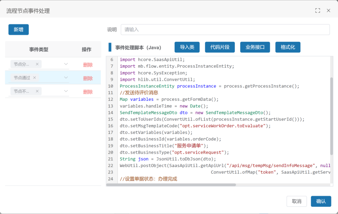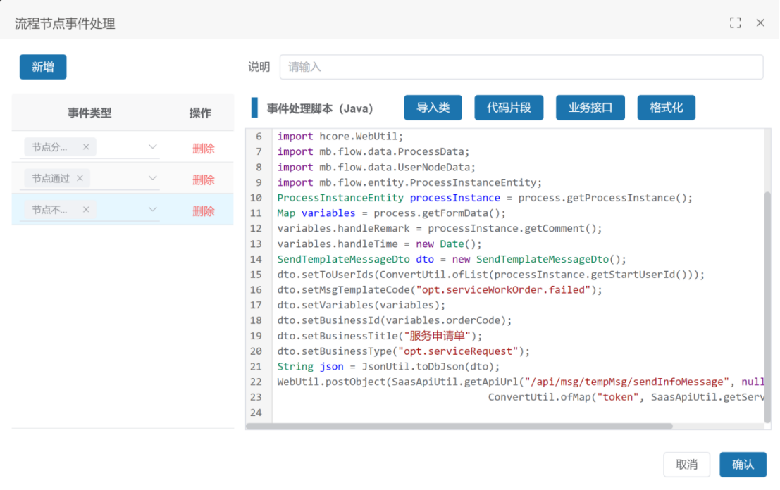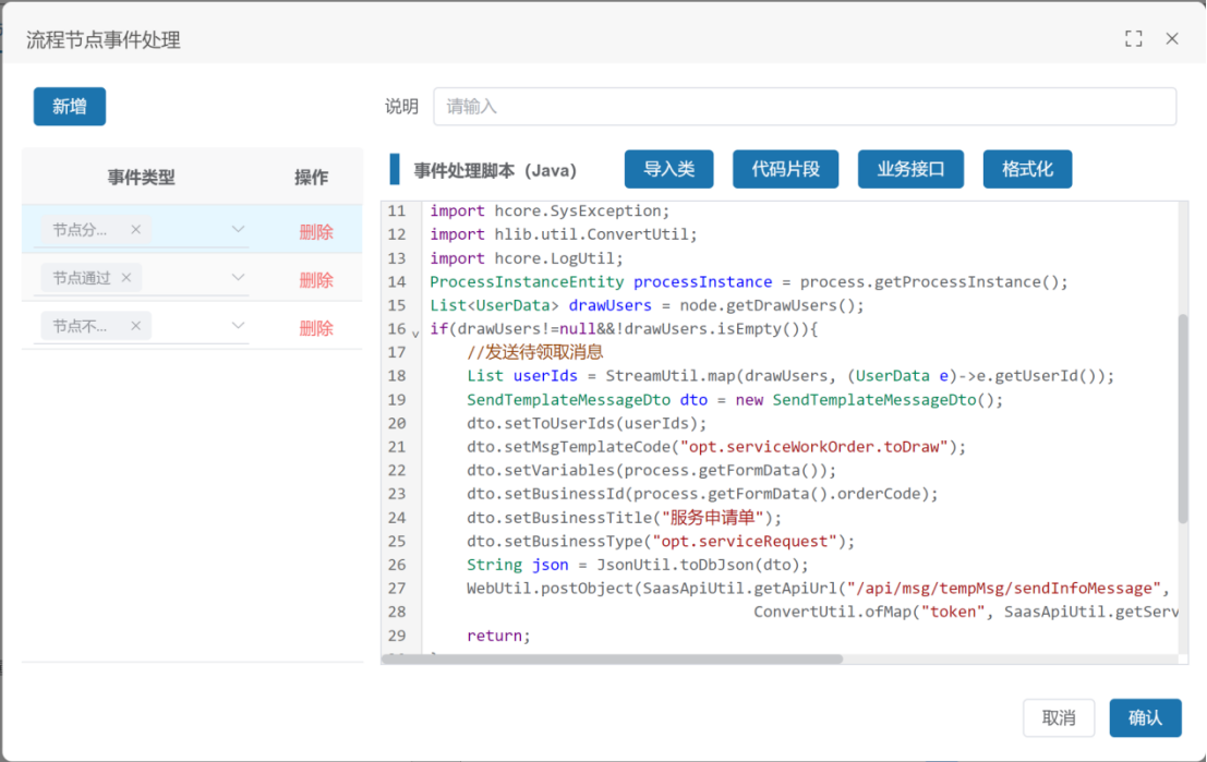 然后,在业务流程的关键节点设置脚本,发送模板消息。