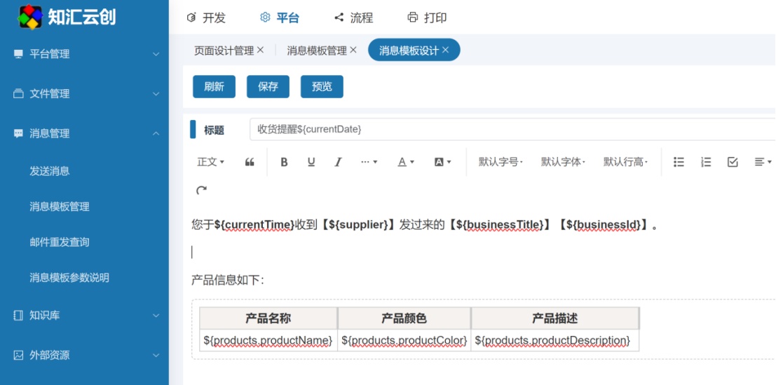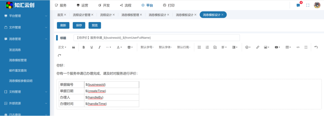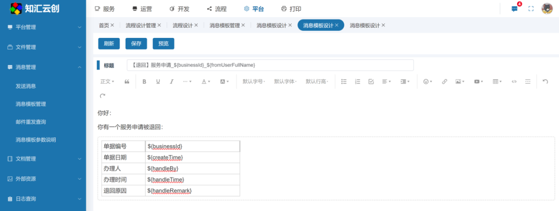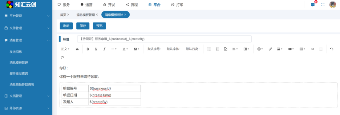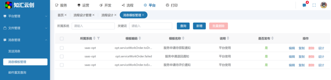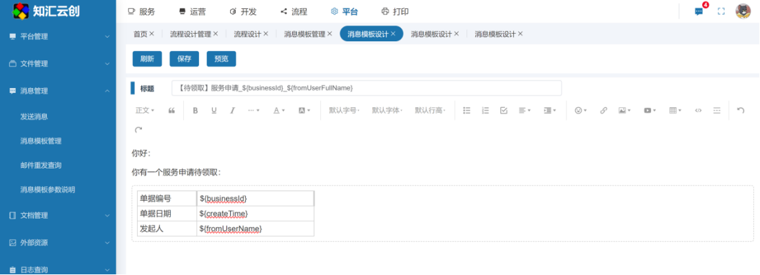 - 支持消息模板的管理与设计,可发送模板消息,支持站内信和邮件功能。