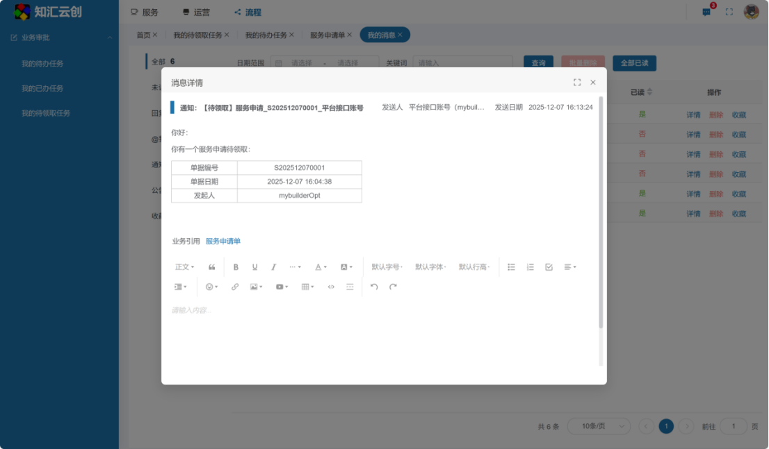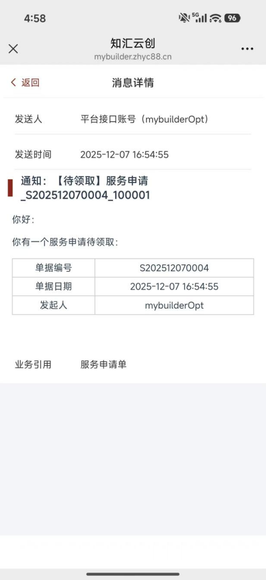 - 用户提交服务申请时,向平台技术支持人员发送消息通知,提醒及时领取办理。