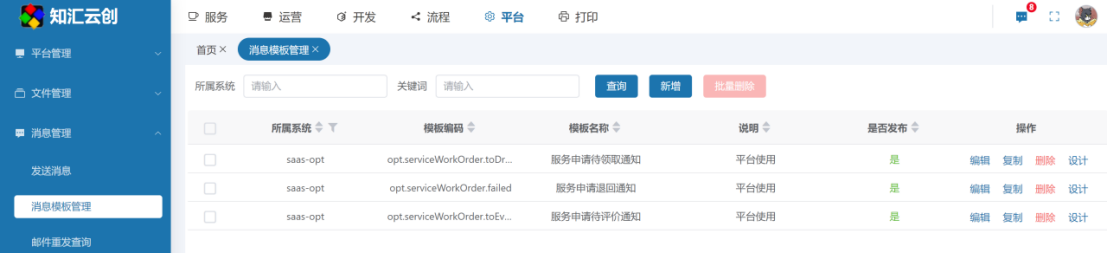 以下是myBuilder开发平台的消息模板管理页面效果与设计效果