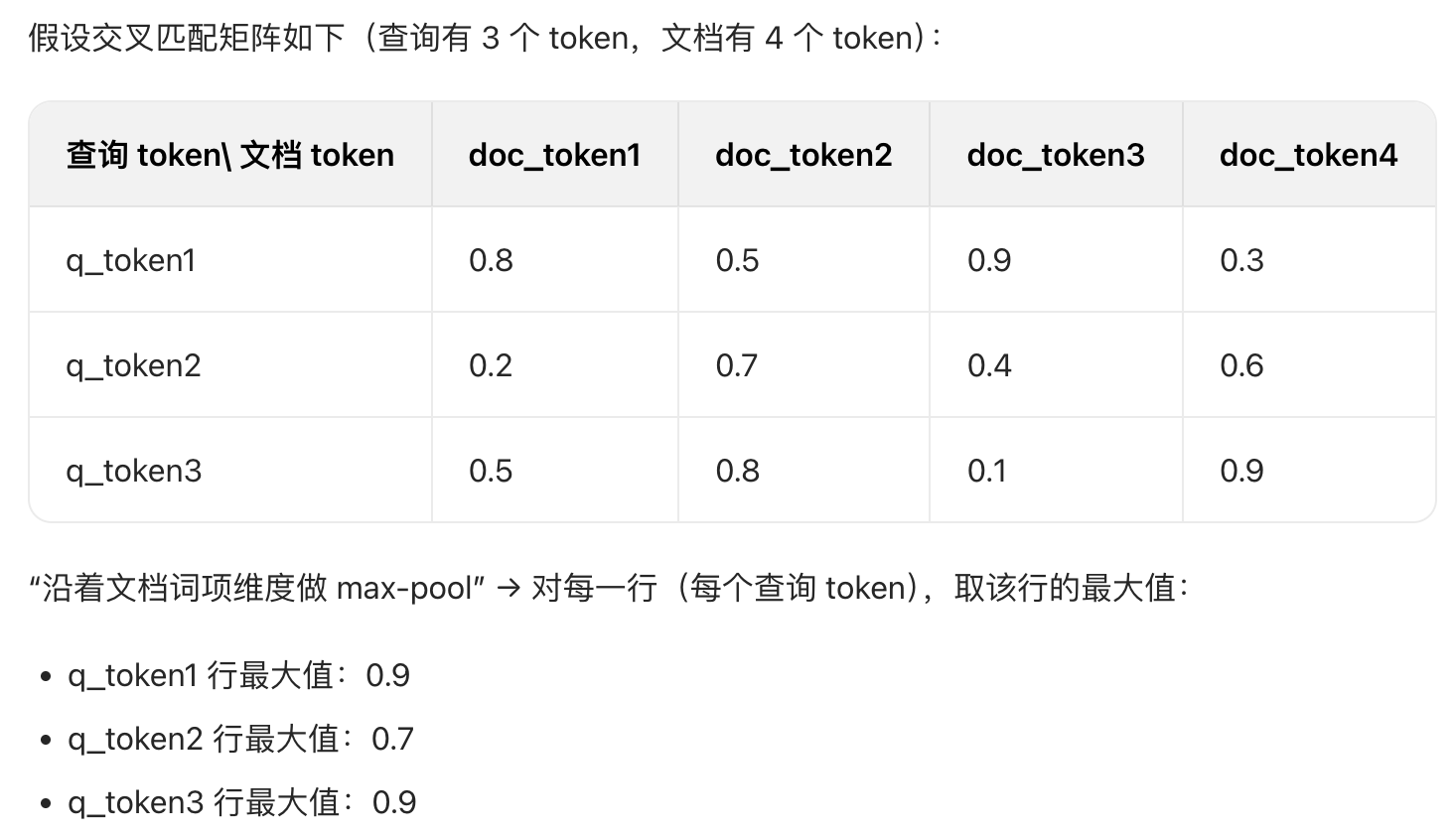 这个操作是 ColBERT "延迟交互" 的关键一步:先通过矩阵保留查询与文档所有 token 的细粒度匹配信息,再通过 max-pool 聚焦 "最相关" 的匹配关系,既保留语义精度,又完成维度压缩,为后续 "对查询词项维度求和"(得到最终文档得分)做准备。