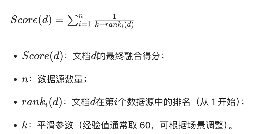 RRF 是检索领域主流的无参数融合算法,无需训练即可平衡不同数据源的排序差异,适配性极强。
