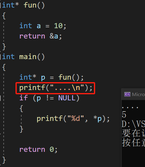 首先调用 fun,内存中会创建 fun 的函数栈帧,调用完成之后 fun 函数栈帧销毁,这块空间就会空出来,接着调用 printf 函数时,又会创建 printf 的函数栈帧,就会把上一次的函数栈帧覆盖了,10 就会改变