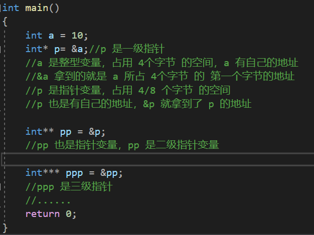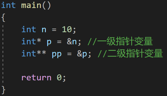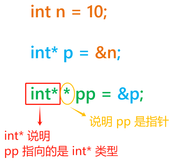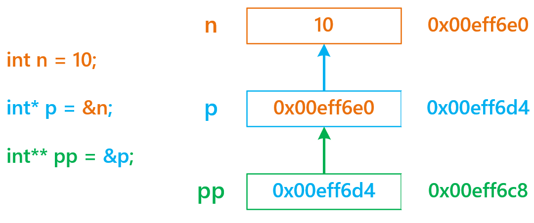 n 的地址存放在 一级指针 p 中,p 的地址存放在 二级指针 pp 中