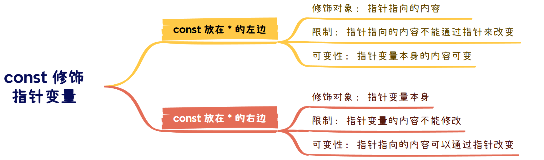 - const 放在 * 的右边 ,修饰 的是 指针变量本身 ,保证 指针变量的内容不能修改 ,但是 指针指向的内容,可以通过指针改变