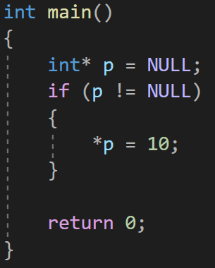 对于 NULL 空指针(0 地址)是不能访问的,因为 *p 没有指向有效空间