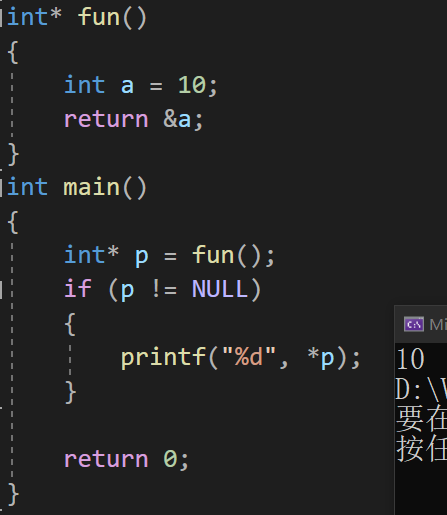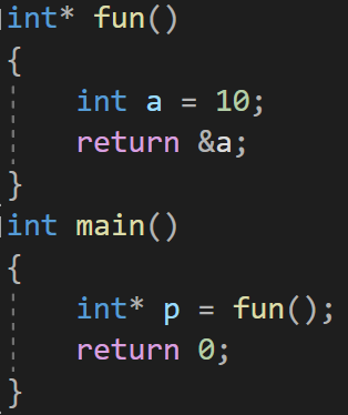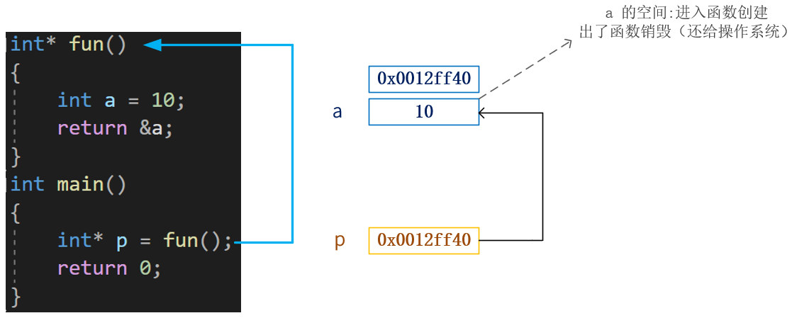 当 fun 函数调用结束(fun 函数栈帧空间销毁),a 变量的空间销毁(还给操作系统,这块空间不属于我们了,不能使用了)