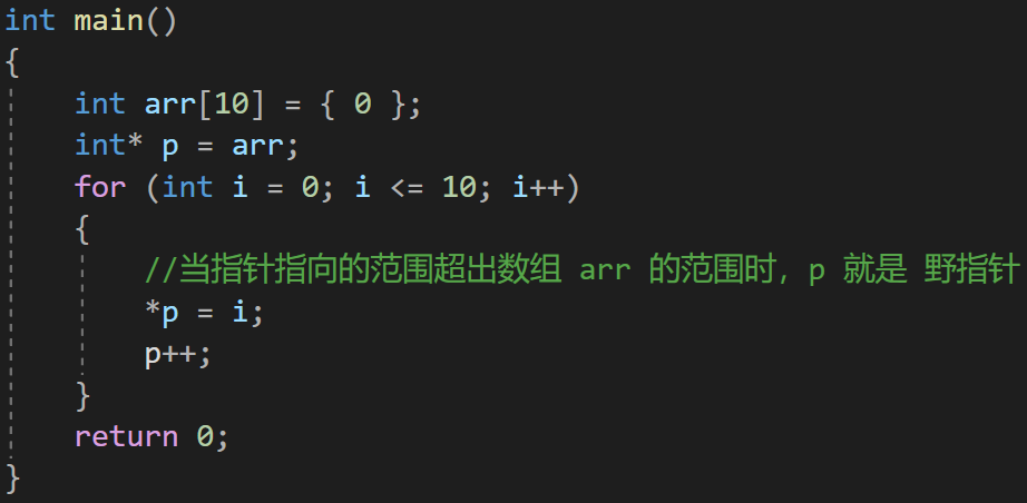 当指针指向的范围超出 arr 的范围,p 就是野指针