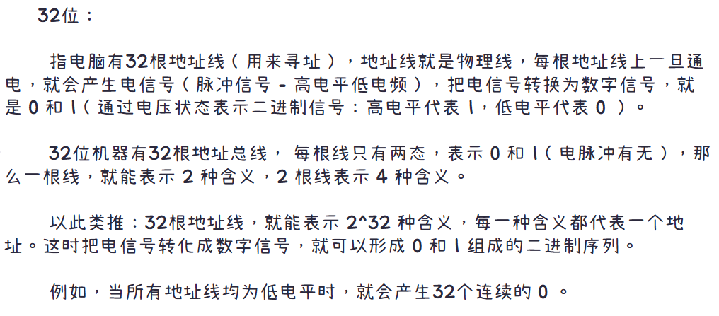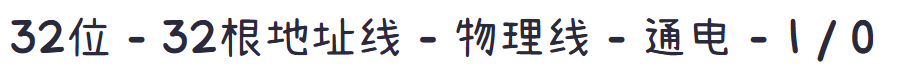 对于 32位 的机器,有 32根地址线,产生 2的32次方 个地址。 每个地址标识一个字节,那我们就可以给 (2^32Byte == 2^32 / 1024KB == 2^32 / 1024 / 1024MB == 2^32 / 1024 / 1024 / 1024GB == 4GB) 4GB 的空间进行编址。那么,2的32次方 个地址可以管理 4个G 的空间。