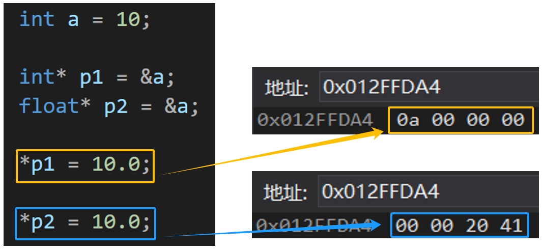 所以,即使 int* 和 float* 解引用都是访问 4 个字节,int* 和 float* 也不可以通用