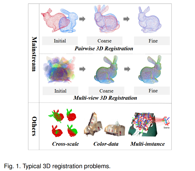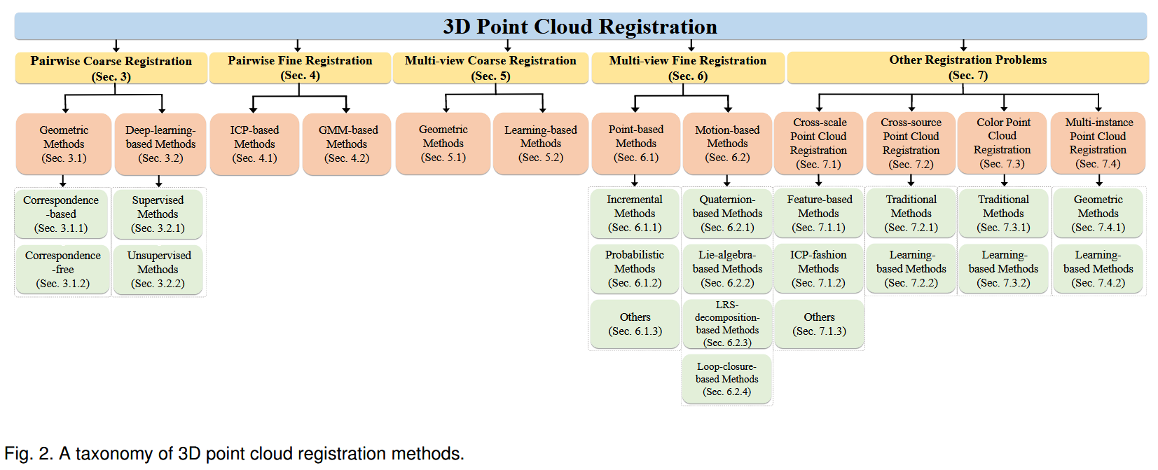 全面的综述和新的分类学。据我们所知,如图2所示,这是第一个全面综述点云配准方法的调查报告,涵盖了成对粗配准、成对精配准、多视图配准、跨尺度配准和多实例配准等一系列子区域。它提供了系统的分类法和广泛的文献覆盖范围。